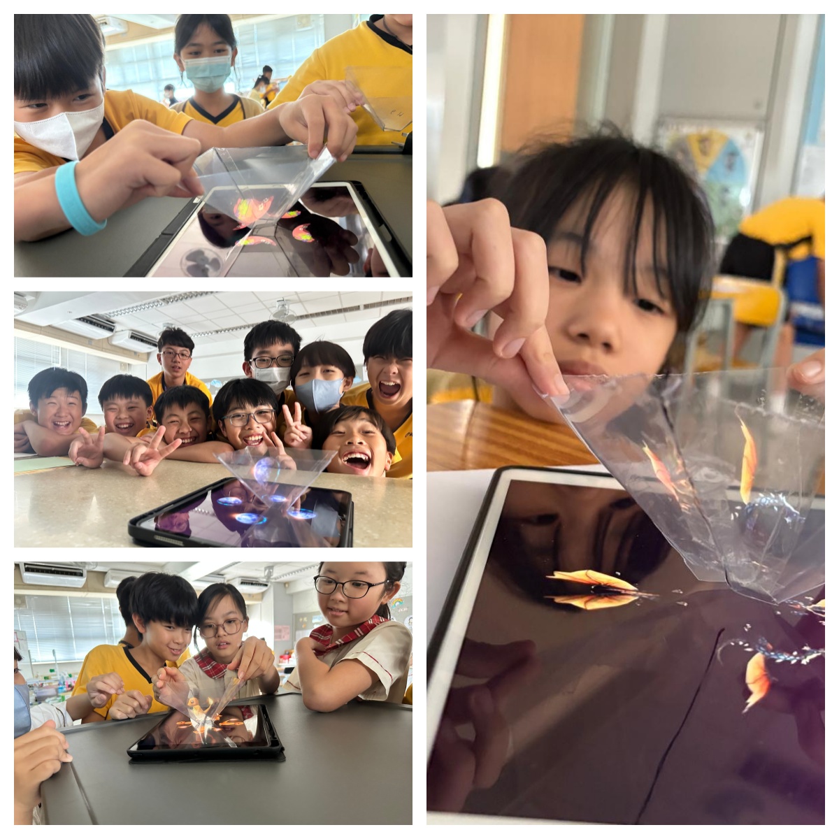 為配合五年級數學科之教學活動,讓學生鞏固對梯形基本特性的認識,探索光的特性,學生利用透明膠片透光和反射平板電腦屏幕上四面的二維影像,造成物件的三維效果。 |